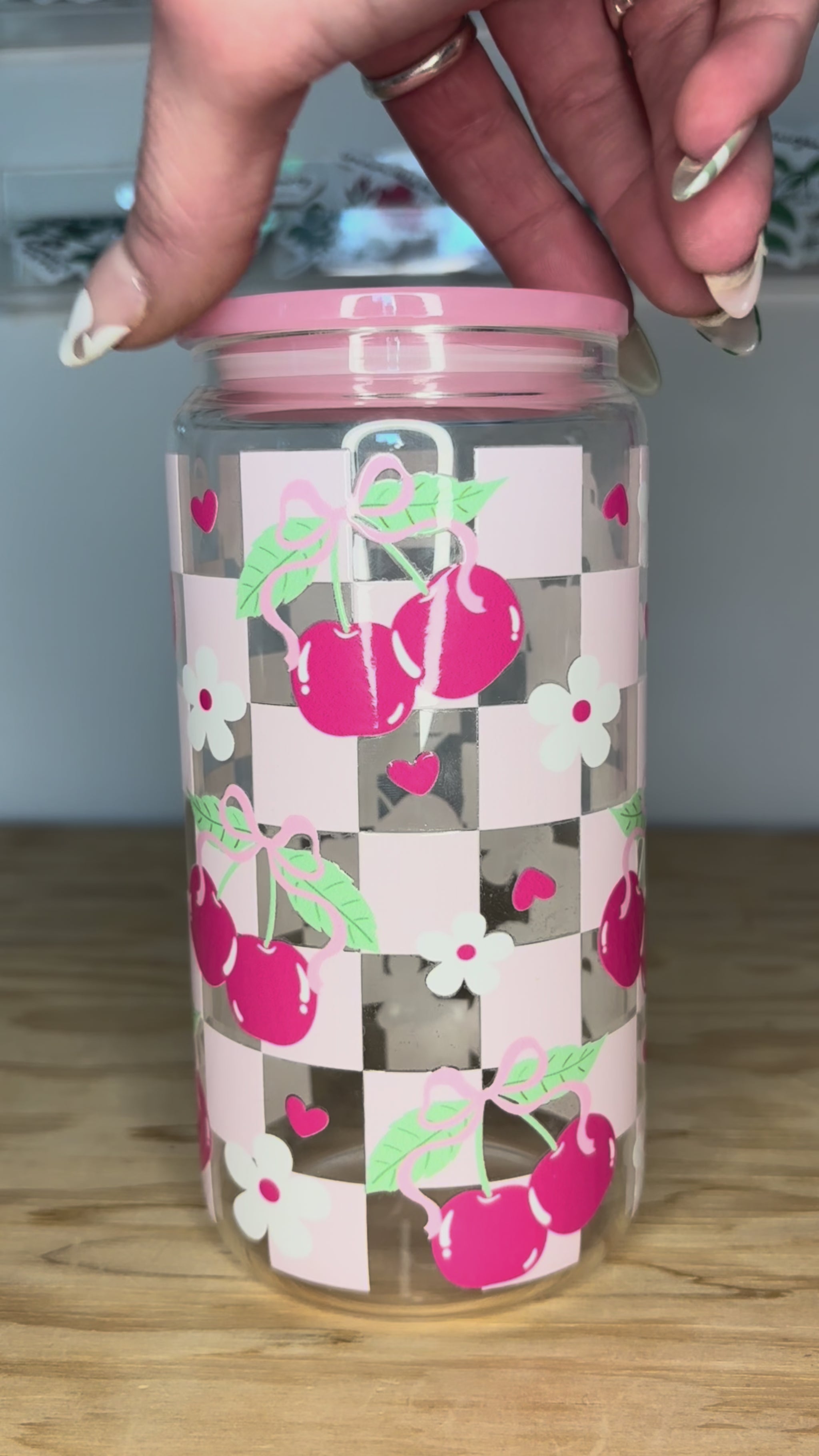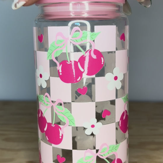 Add a pop of pink to your everyday routine! This Cherry Check Cutie 16 oz glass cup features cheerful pink cherries with dainty bows set against a classic checkered background — the perfect mix of retro charm and girly sweetness.